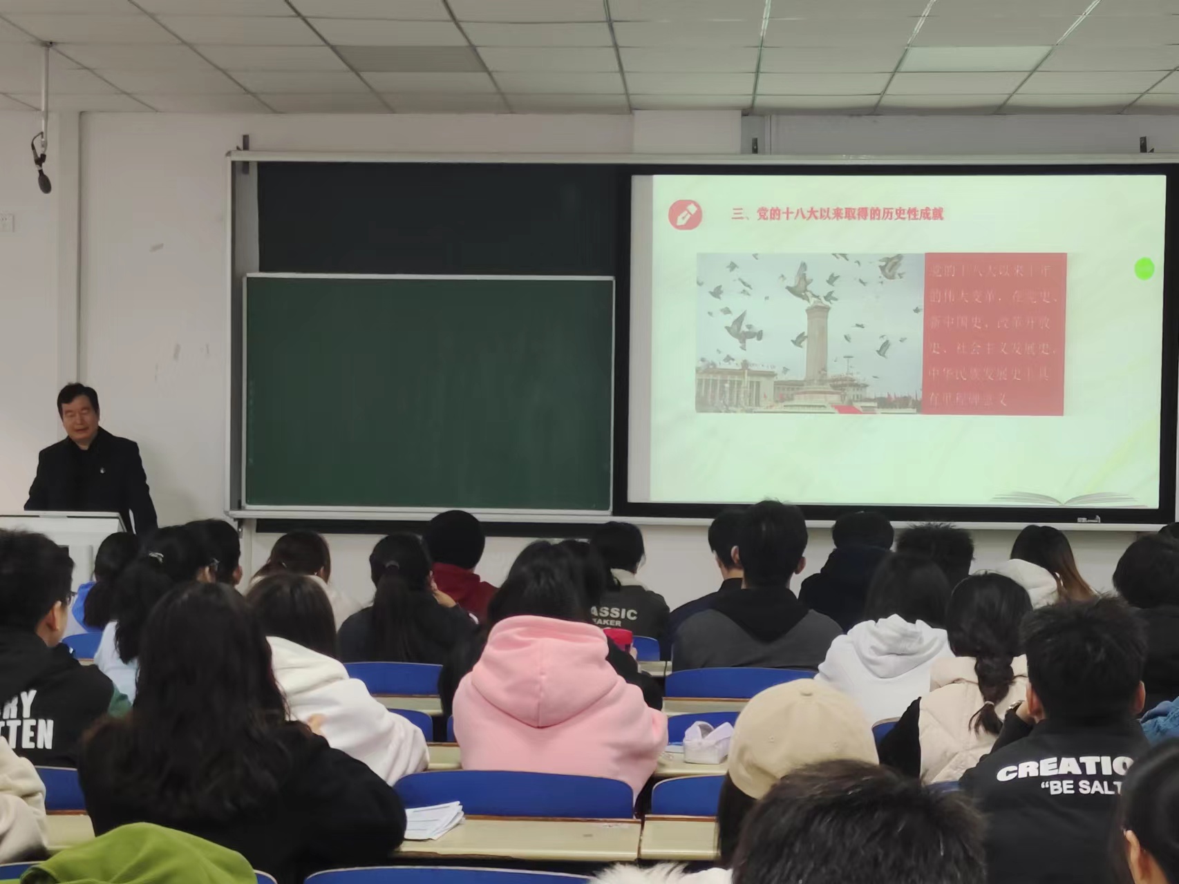 康殿峰从“党的十八大以来取得的历史性成就”等四个方面深入解读了习近平总书记在中国共产党第二十次全国代表大会上的重要讲话精神。习近平总书记代表党的第十九届中央委员会做的大会报告,提出了一系列新观点、新论断、新思想、新战略、新要求。进一步指明了党和国家事业的前进方向,是我们党团结带领全国各族人民在新时代新征程坚持和发展中国特色社会主义的政治宣言和行动纲领。学习贯彻习近平总书记的报告精神,是全党今后一个时期最重要的政治任务。同学们要牢记习近平总书记对青年人的谆谆教导,坚定不移听党话、跟党走,怀抱梦想又脚踏实地,敢想敢为又善作善成,立志做有理想、敢担当、能吃苦、肯奋斗的新时代好青年,让青春在全面建设社会主义现代化国家的火热实践中绽放绚丽之花。