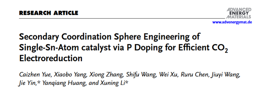 近日,公司新能源材料与器件团队在Advanced Energy Materials(一区TOP期刊,影响因子:27.8)发表了题为 Secondary Coordination Sphere Engineering of Single-Sn-Atom catalyst via P Doping for Efficient CO 2 Electroreduction 的学术研究论文。通过合理设计探索出P掺杂在第二配位壳层的Sn单原子催化剂(P-SnN4-CNT),结合原位表征技术和DFT计算揭示了P在反应过程中的重要作用以及Sn单原子电催化二氧化碳还原到CO的真实活性位点。