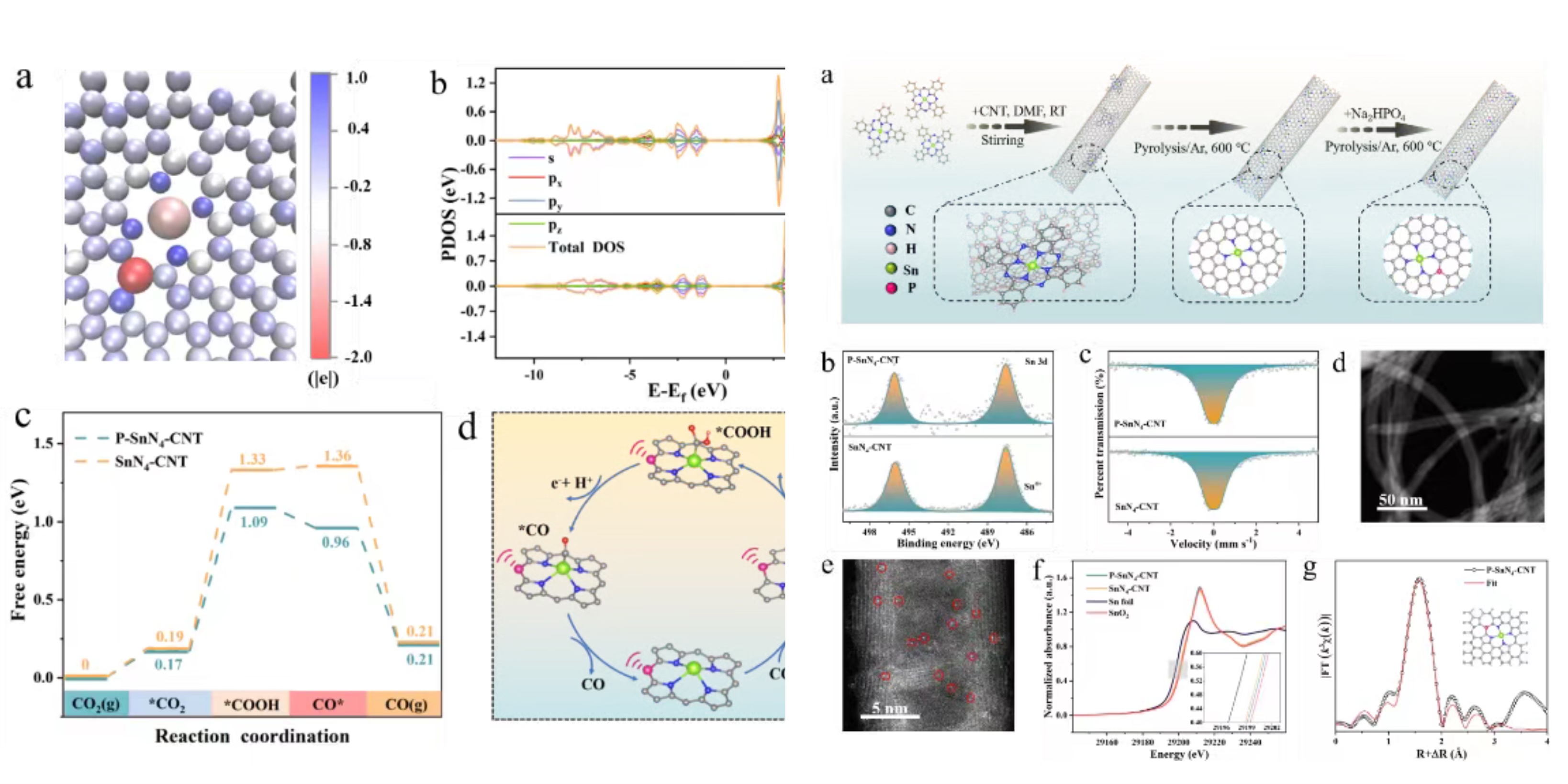 本工作将定义明确的锡酞菁温和热解到碳纳米管上来设计Sn-N-C催化剂。通过P掺杂,成功地将P原子引入Sn中心的第二配位壳层中。所得到的P-SnN4-CNT表现出对于电催化二氧化碳还原到CO表现出优异的活性,并结合原位衰减全反射表面增强红外吸收光谱、准原位X射线光电子能谱和DFT计算,明确揭示了P掺杂Sn单原子位点对电催化CO2RR生产CO的本征结构作用。
