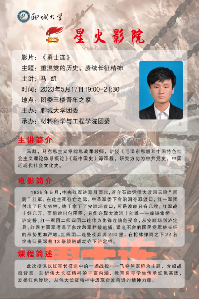聆听红色故事、品鉴红色影片、传承红色基因、争做红色传人。2023年5月17日,伟德国际VICTOR1946于东校区实验实训楼报告厅举办“星火影院”观影活动。本次活动观看的影片是《勇士连》,特邀马克思主义公司思政课教师马凯老师担任主讲嘉宾,马老师讲授的微党课题目是《重温党的历史,赓续长征精神》。
