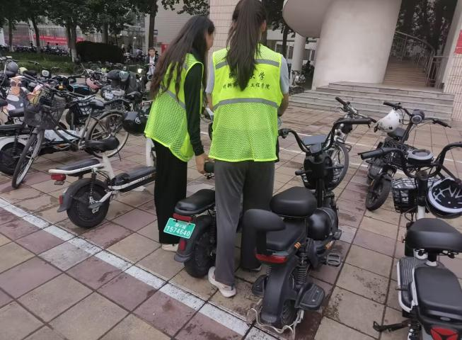 伴随着同学们的踊跃参与,活动拉开序幕。活动开始时,同学们对活动的整体开展找不到方向,但是随着活动的不断推进,他们两人一组,互相帮助,共同对区域内摆放杂乱的车辆进行重排,并对附近的垃圾进行清理,使得停车区域整洁有序。志愿者在志愿期间,积极提醒过往同学们正确佩戴头盔,禁止载人,自觉做到文明骑行、安全骑行,随着整体区域摆放车辆工作的完成,本次活动已接近尾声。