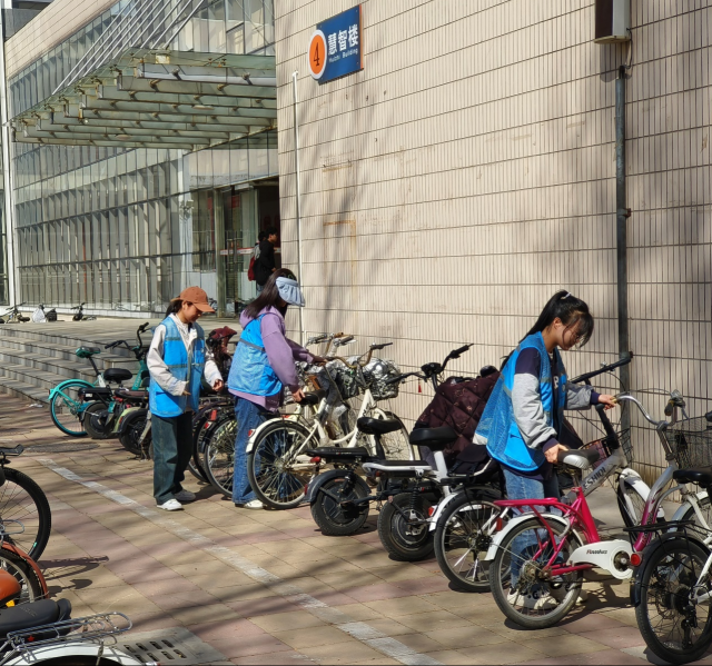 第三组活动中,同学们穿梭于教学楼间,认真整理乱停乱放的非机动车,自觉优化校园环境。同学们表示,本次活动有助于提升美化校园的参与感和荣誉感,日后将以实际行动自觉维护优美的校园环境。