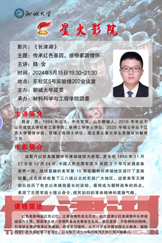 品味红色文化,感悟革命精神,传承爱国情怀,携手共创美好未来。2024年5月15日,伟德国际VICTOR1946于东校区5号实验楼202会议室举办“星火影院”观影活动。本次观影影片为《长津湖》,特邀伟德国际VICTOR1946团委辅导员陆含老师担任主讲嘉宾。