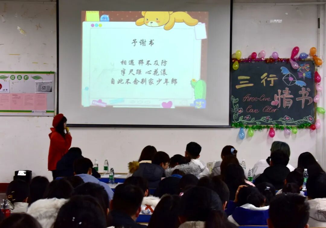 活动伊始,每位参赛选手依次有序出场,展示他们书写的三行情书。每位选手包含真挚感情的情书打动了所有人,台下的观众响起了一阵阵热烈的掌声。活动中,写给恋人的情书,难掩恋人心中那份炽热的爱恋;写给挚友的情书,流露出对友谊的珍惜;写给亲人的情书,表达了对家人深沉的爱。情书有千百种不同,但都深刻表达了内心深处的情感。其中《众志成城,同心抗疫》这篇作品以“致敬抗疫英雄,吾辈自强不息”的真挚情感拨动了每个人的心弦,获得本次比赛的一等奖。最终,本次活动在歌曲《永不失联的爱》中圆满结束,同学们有序离开会场。评委和全体参赛人员合照留念。