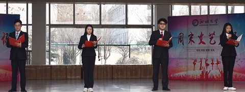 我和我的祖国共命运,我和我的祖国同成长。活动伊始,由辛巳嘉,王国顺,李涵,刘新宇同学带来的朗诵《我和我的祖国》,响应着文艺广场活动主旋律的号召,让同学们在聆听之余,不忘赤子爱国之心。