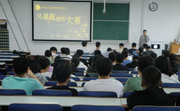 比赛之前,活动负责人将比赛物品准备妥当,向大家分享了“风暴瓶”的相关知识与制作过程。在制作过程中,同学们将天然樟脑和乙醇充分混合,待到溶液透明澄清后,同学们把硝酸钾和氯化铵按照比例配置混合溶液,经过适当摇晃搅拌后进行水浴加热,直至溶剂彻底溶解。