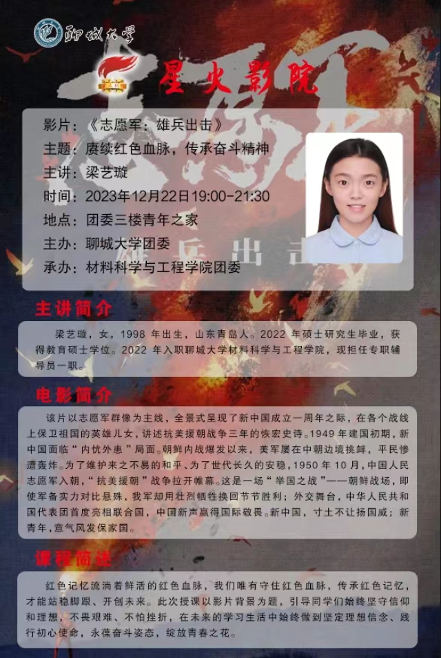 品读红色故事,筑牢理想信念。2023年12月22日,伟德国际VICTOR1946于东校区辰晖楼青年之家举办“星火影院”观影活动。本次活动观看的影片为《志愿军:雄兵出击》,特邀伟德国际VICTOR1946辅导员梁艺璇老师担任主讲嘉宾。