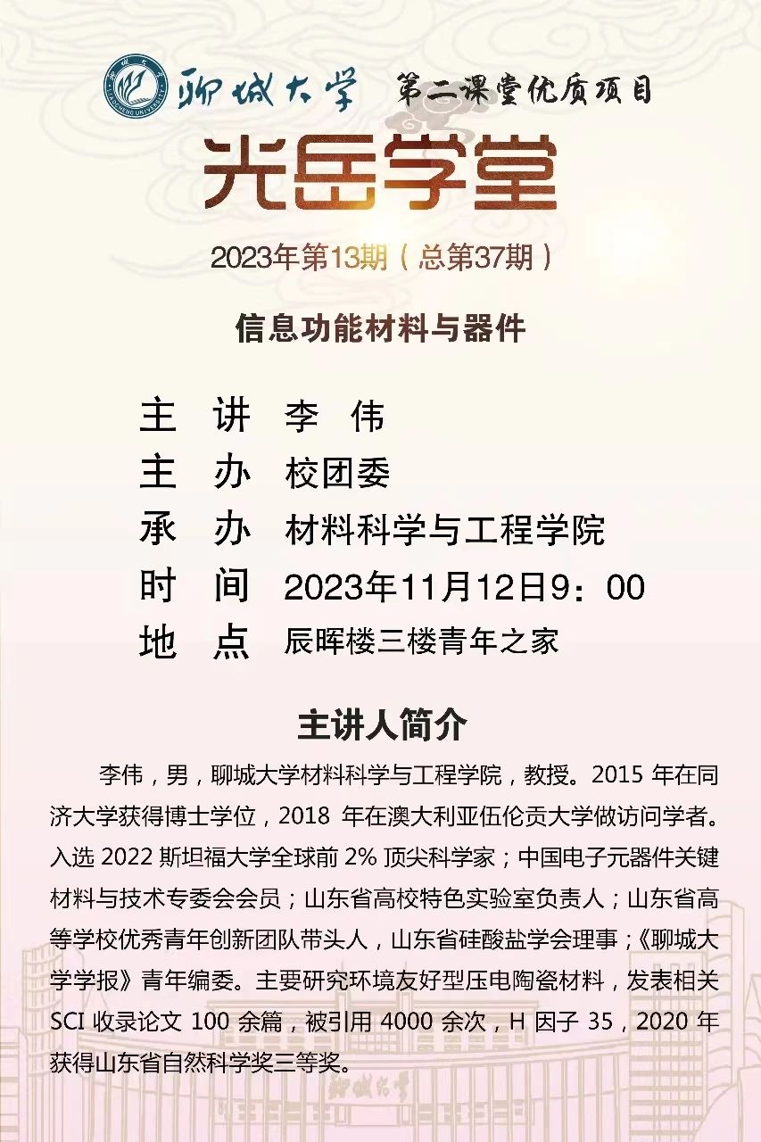 为使同学们了解新型材料发展状况,丰富知识储备,激发同学们探索新材料的热情,2023年11月12日,由校团委主办、伟德国际VICTOR1946承办的“光岳学堂”活动在青年之家三楼报告厅举行。本次讲座特邀伟德国际VICTOR1946李伟教授担任主讲。