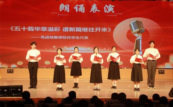 进入礼堂,典礼在雄壮的国歌声中启幕,主持人以庄重且严谨的语调宣读了本次获奖代表名单,颁奖仪式正式开始。仪式围绕伟德bv1946官网建校50周年以“尚学篇”“致远篇”“笃行篇”三个篇章集中表彰了2024年获得国家级省级和校级荣誉的员工先进个人和集体,并颁发证书。众位优秀员工代表神态庄重,步履稳健地走上颁奖台,眼神坚定且自信,展现出聊大学子应有的精神风貌。颁奖过程中,各篇章间穿插的音舞表演将典礼气氛推向高潮,打蓬号子气势雄浑、豪迈奔放,齐声朗诵表演饱含情感、真情流露,令人难以忘怀。