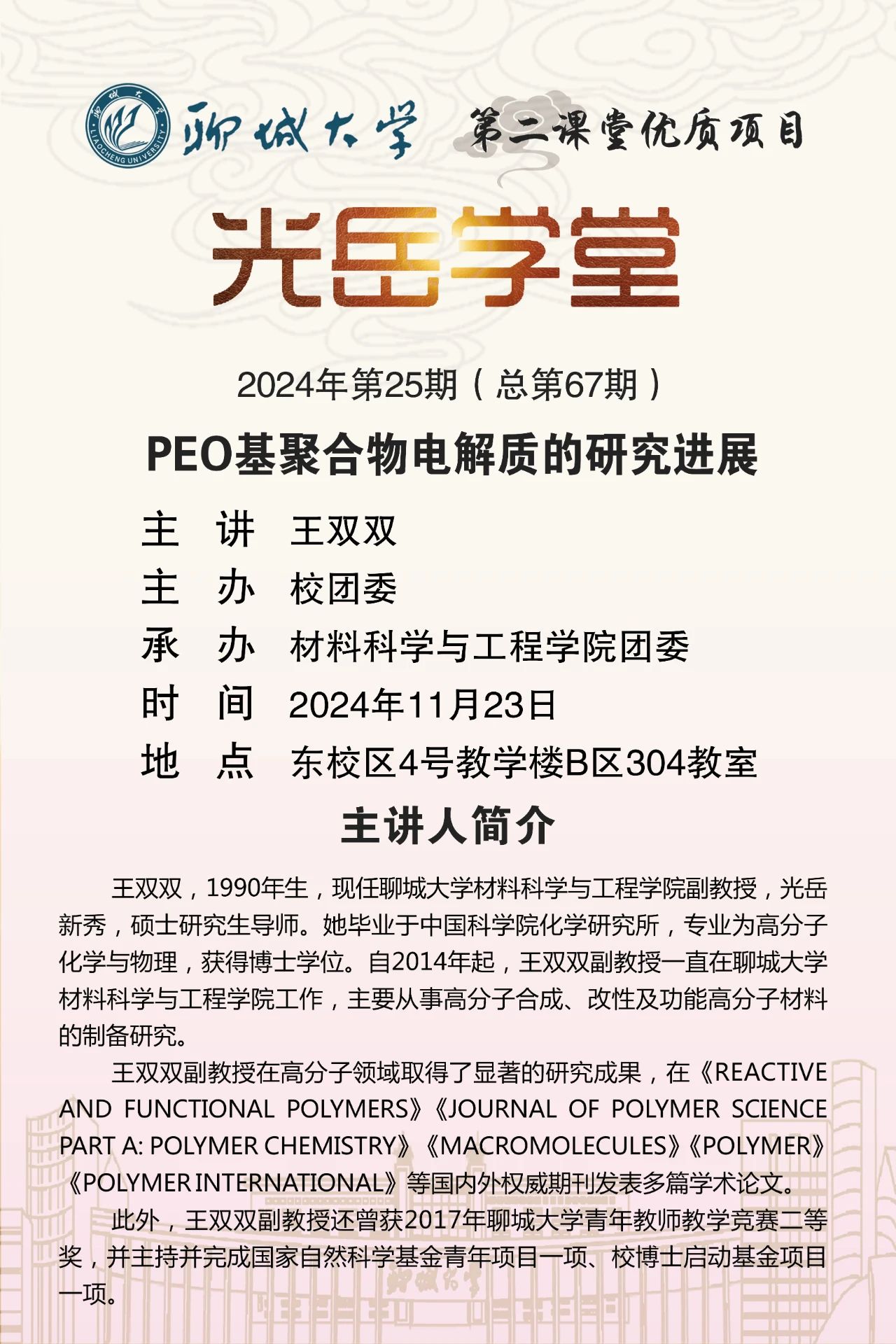 为引导员工深入了解材料专业,拓宽学术视野, 2024年11月23日,由伟德bv1946官网校团委主办、伟德国际VICTOR1946承办的“光岳讲堂”活动于东校区4#B304举行,本次活动特邀伟德国际VICTOR1946王双双副教授担任主讲嘉宾。