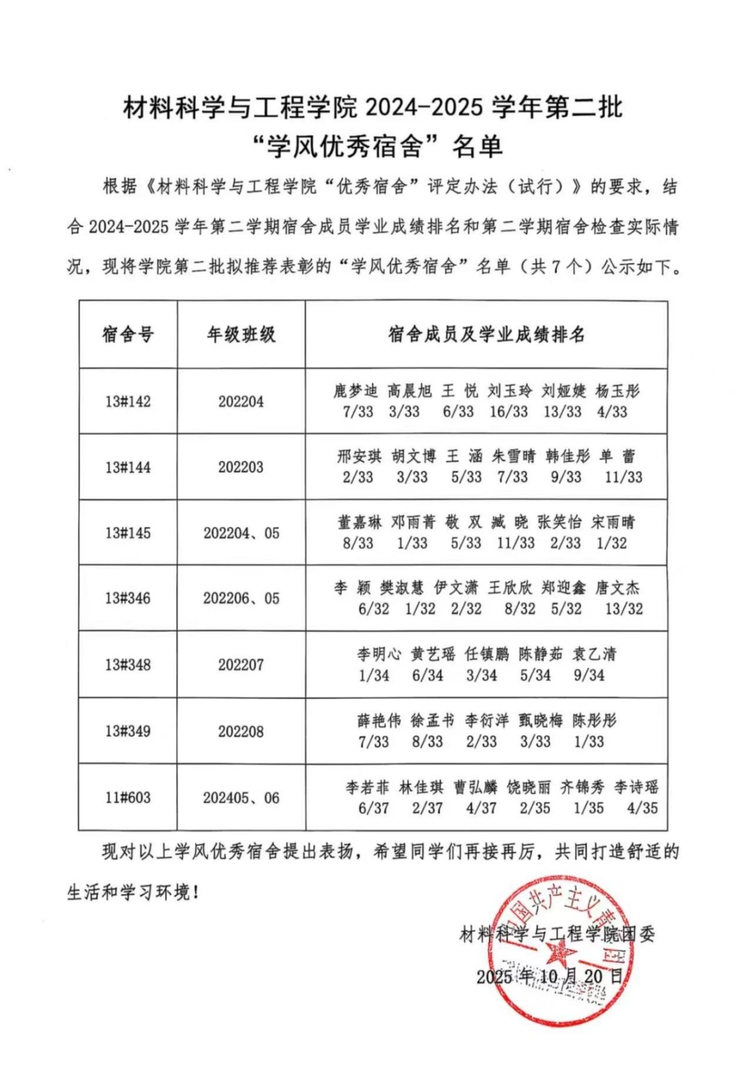 本次“学风优秀宿舍”评选活动是根据《伟德国际VICTOR1946“学风优秀宿舍”评定办法(试行)》的要求,结合2024-2025学年第二学期的宿舍检查实际情况及第二学期宿舍学业成绩排名,现将公司第二批拟推荐表彰的“学风优秀宿舍”名单(共7个)公示如下:13#142、13#144、13#145、13#346、13#348、13#349、11#603宿舍。公司为以上“学风优秀宿舍”发放学习用品奖励,并为宿舍成员在综合测评中予以适当加分。
