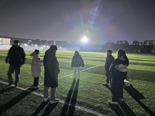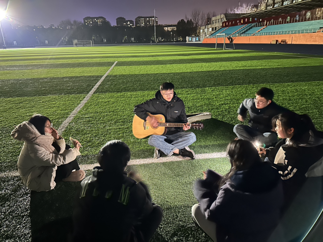 接下来的游戏使“猫和老鼠”,这个游戏需要每个人换上代表自己身份的头像,并加入共享位置,如果老鼠被抓到了那他就变成了猫。同学们在偌大的操场上东奔西跑,尽力躲藏,以免自己被抓到,游戏结束时每个人都跑得筋疲力尽,气喘吁吁,大汗淋漓,但同时大家也都在轻松活泼的氛围中体验到了童年的快乐,也在暴汗中释放了学习压力。活动最后,跑累的同学们用吉他演唱作为落幕,几个人围成一个圈,静静地听着同学弹出的优美曲调。