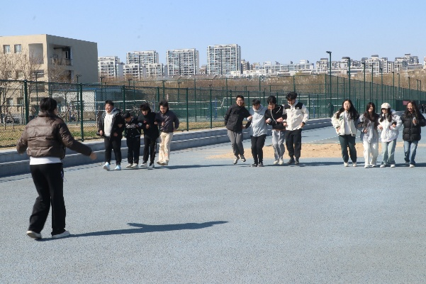 第三个游戏是“桃花朵朵开”,所有参与者围成一个大圈跑动,主持人随机喊出一个数字,参与者需根据数字迅速抱在一起。这一游戏不仅考验了同学们的反应速度,还增强了团队协作能力。紧接着是“四个人跨手跳”游戏,四人一组手挎着手向前跳,最先到达终点的组获胜。这一环节不仅提升了同学们的团队合作意识,还让大家在运动中释放了压力,体验了集体活动的乐趣。最后一个游戏是“你画我猜”,一位参与者根据指定内容比划,其余人猜测比划的内容。这一游戏不仅考验了同学们的想象力和表达能力,还为大家带来了许多欢乐,现场气氛达到了高潮。
